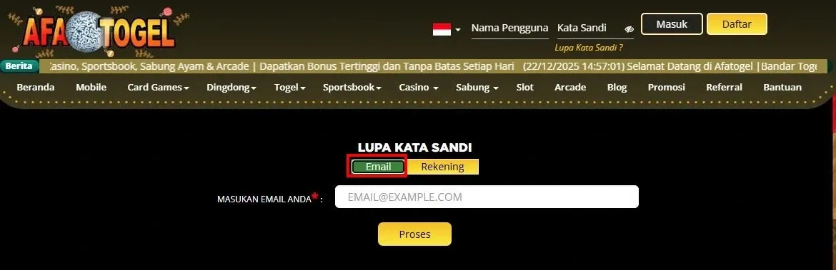 Masukkan email pada kolom tertera, sesuai dengan email yang sudah Anda verifikasi sebelumnya pada akun Anda. Setelah mengisi Email Anda, klik tombol "Proses" kata sandi baru Anda akan dikirim ke Kotak Masuk atau Spam pada email.