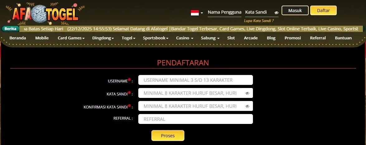 Langkah - langkah untuk membuat akun atau userID di AFATOGEL :