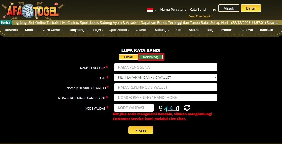Silakan isi data form Lupa Kata Sandi sesuai saat Anda mendaftar akun. Setelah data yang Anda isi telah benar, klik "Proses" maka kata sandi yang baru akan muncul pada layar Anda.