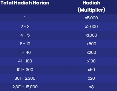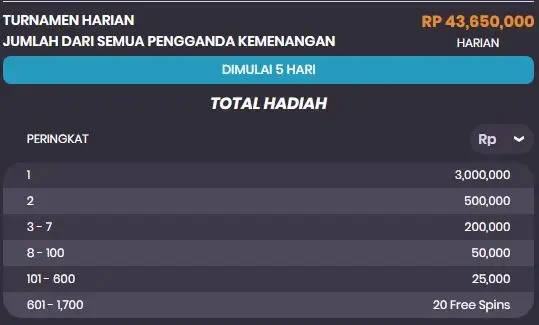 - Jika Turnover anda sebesar 100.000.000 dalam satu minggu, maka member berhak mendapatkan hadiah 100.000.000 x 1.5% (Fee) = 1.500.000